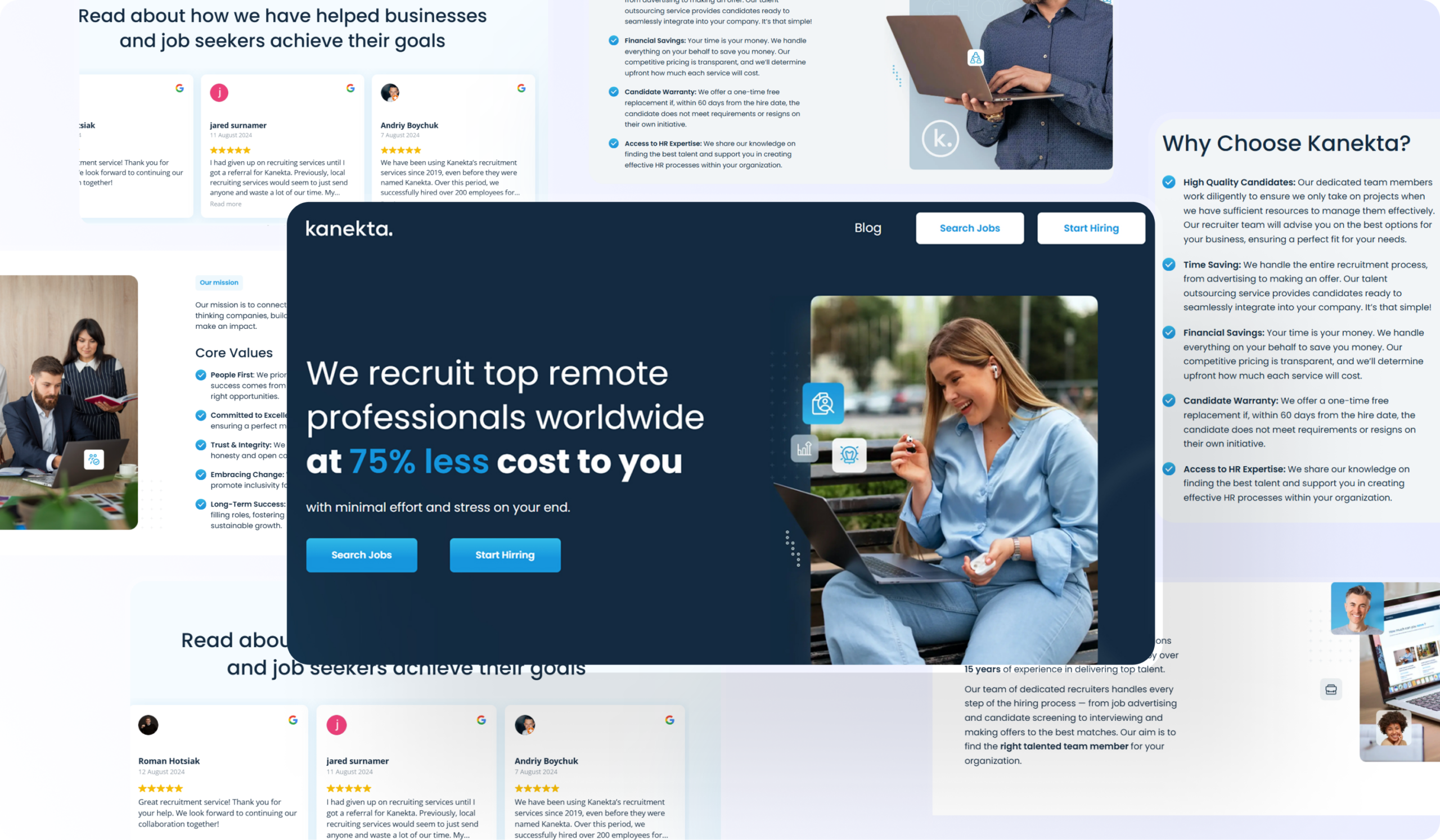 Kanekta is a premier recruitment agency specializing in identifying high-quality remote professionals worldwide. Their core value proposition allows businesses to reduce hiring costs by up to 75% compared to U.S.-based alternatives, without compromising on expertise or professionalism. Kanekta manages the entire recruitment lifecycle—from job posting and screening to interviews and final offers—serving as a strategic partner for companies aiming for efficient, scalable growth.
