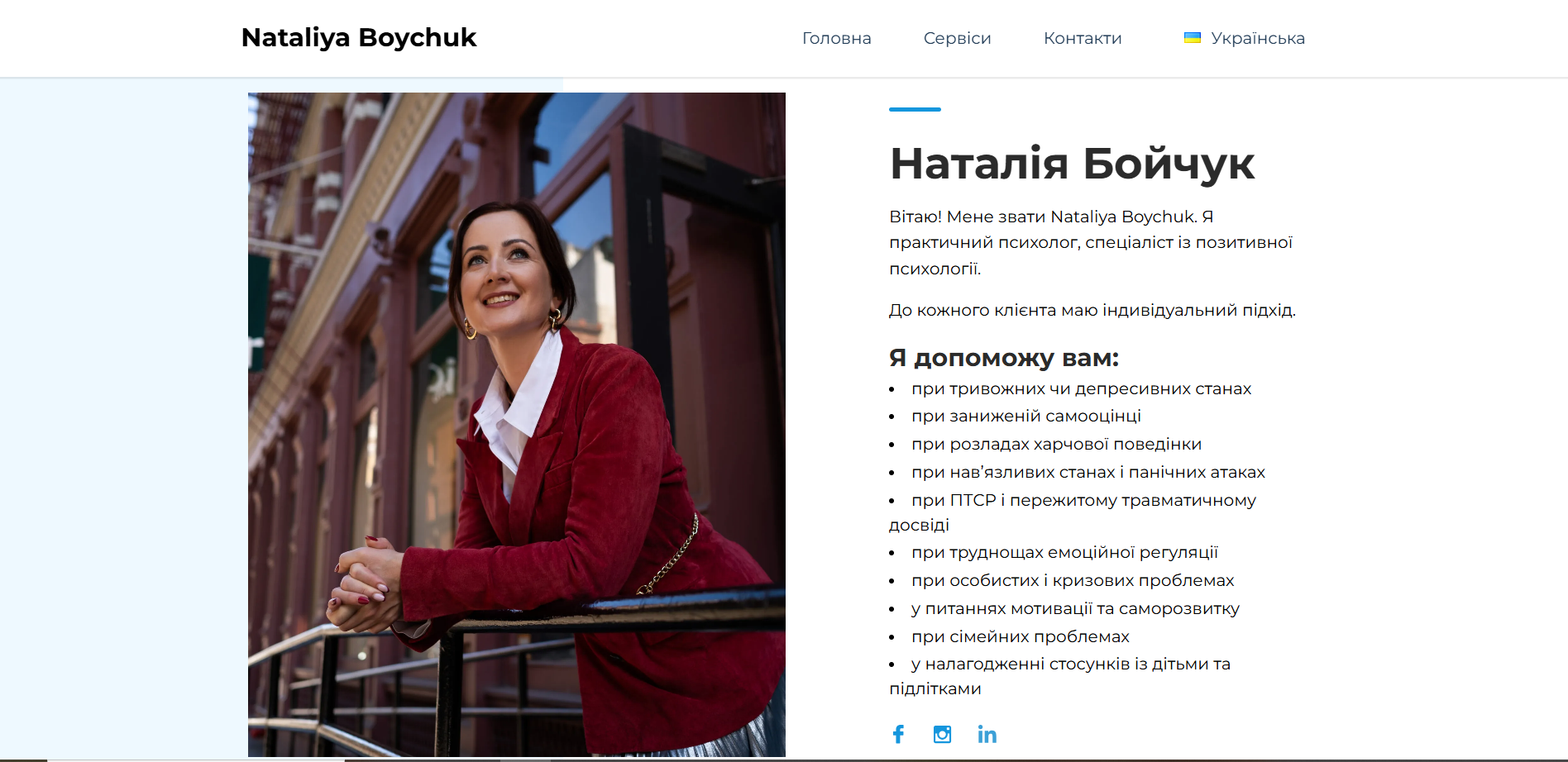 We created a professional portfolio website for Nataliya Boychuk to present her expertise and services in an elegant and structured way. The design is clean and modern, focusing on clarity and usability across all devices. We also added basic SEO settings and connected tools to help track site performance and traffic.