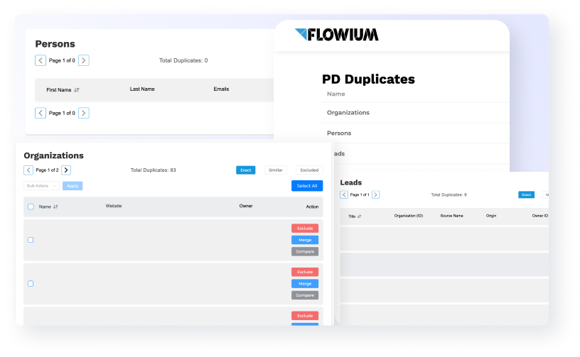 Duplicate management in Pipedrive became easier for Flowium thanks to a powerful custom tool that detects duplicate organizations, people, and leads, distinguishing between exact and partial matches. The tool supports manual merging through a user-friendly interface and automates daily merges via the Pipedrive API — improving data accuracy, saving time, and boosting sales team productivity.