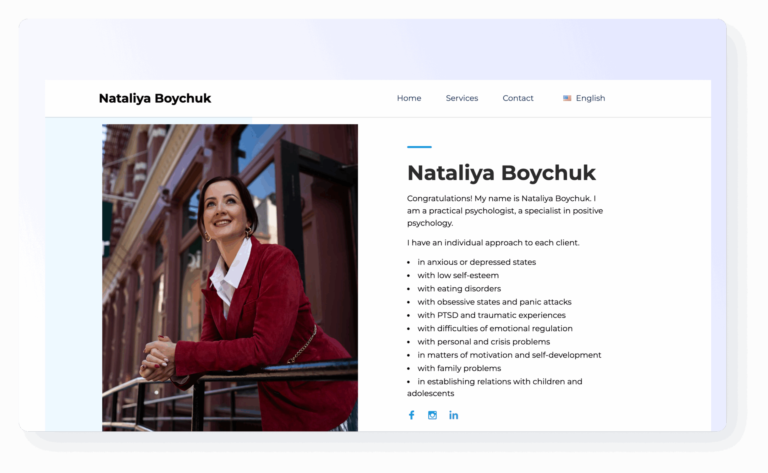 Read MoreWe created a professional portfolio website for Nataliya Boychuk to present her expertise and services in an elegant and structured way. The design is clean and modern, focusing on clarity and usability across all devices. We also added basic SEO settings and connected tools to help track site performance and traffic.