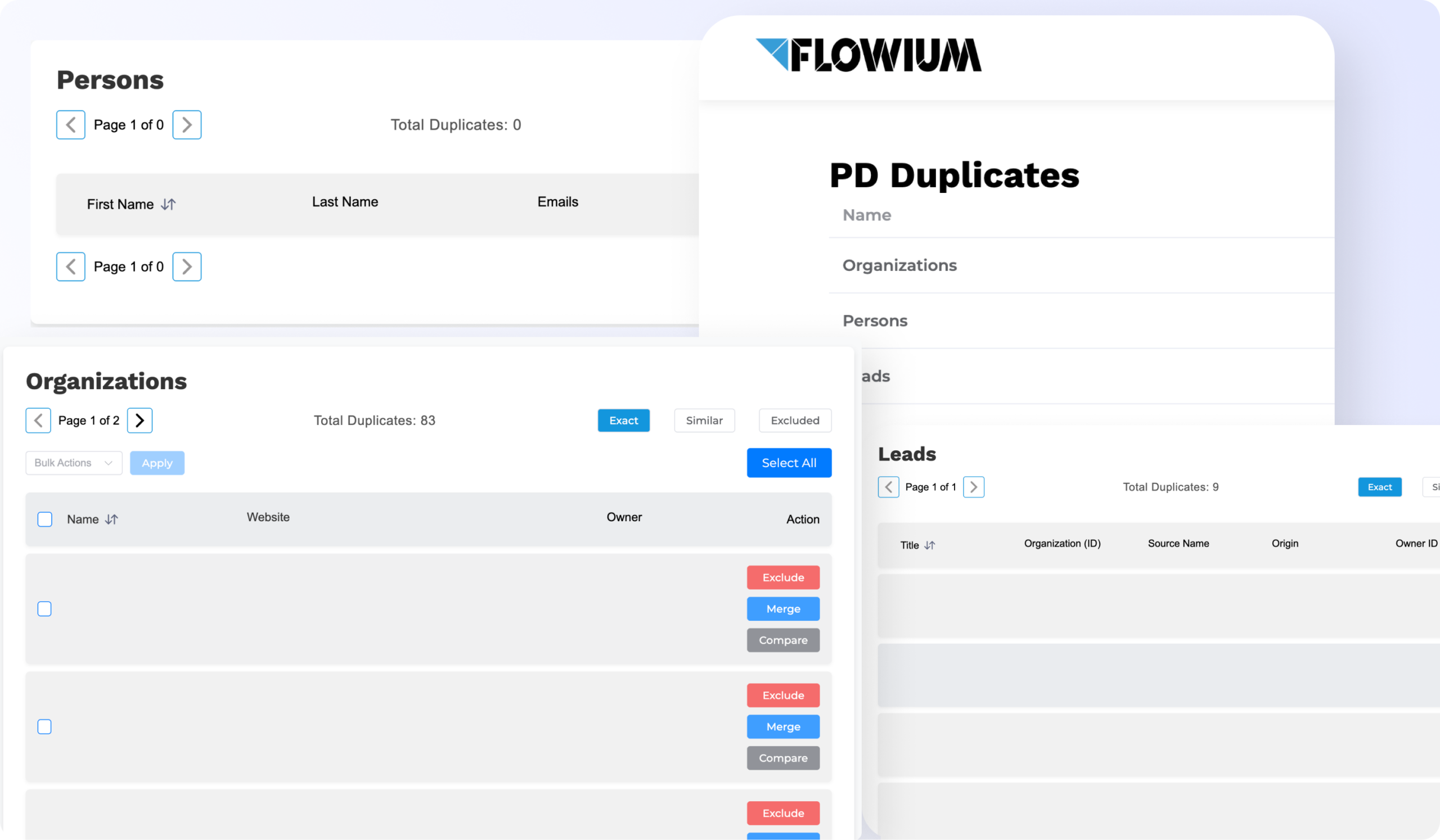 Read MoreDuplicate management in Pipedrive became easier for Flowium thanks to a powerful custom tool that detects duplicate organizations, people, and leads, distinguishing between exact and partial matches. The tool supports manual merging through a user-friendly interface and automates daily merges via the Pipedrive API — improving data accuracy, saving time, and boosting sales team productivity.